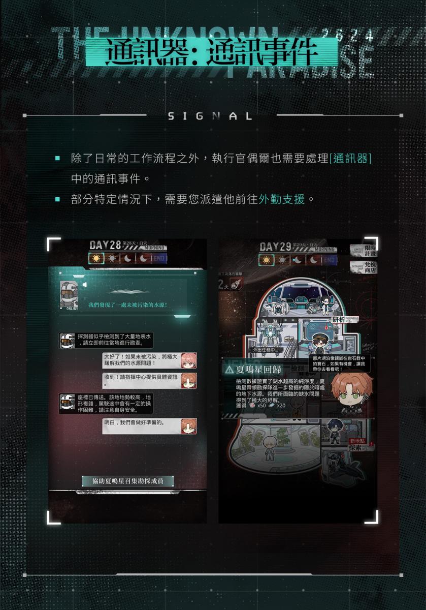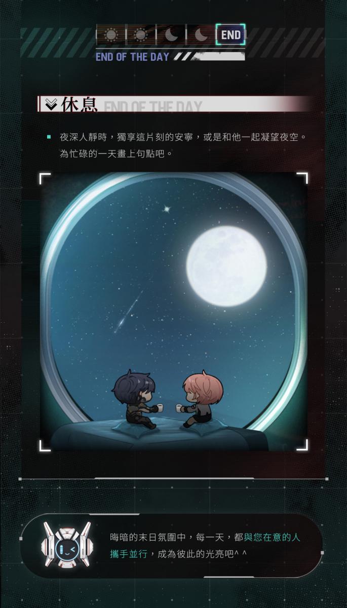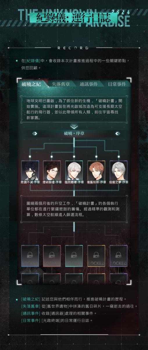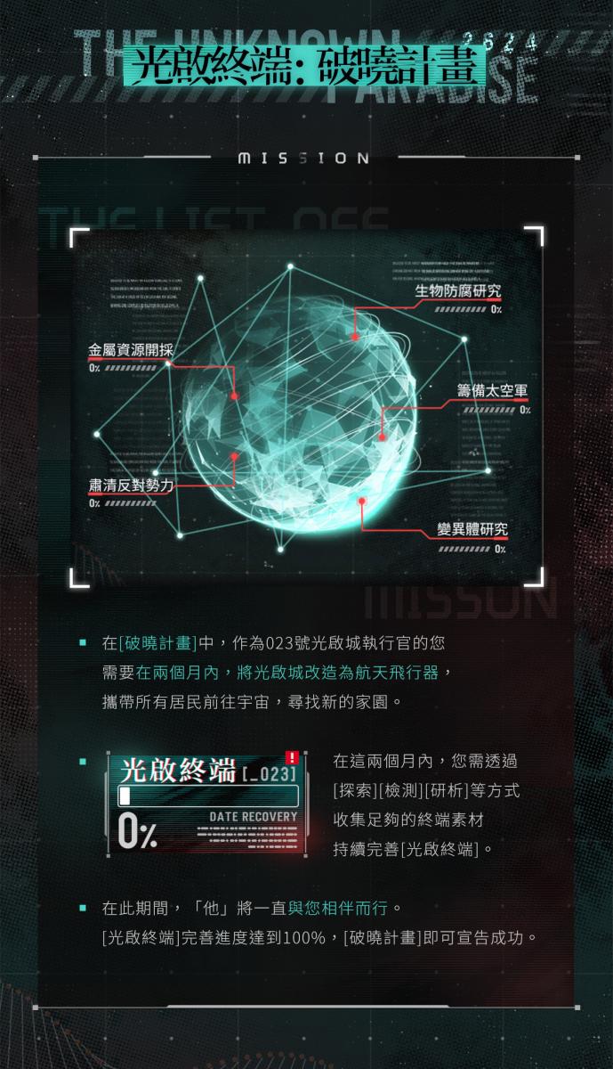 收集資源不斷完善[光啟終端],推進[破曉計畫],即可解鎖與他的專屬劇情故事。 解鎖的劇情故事將收錄在[記錄儀→破曉之紀]中,活動期間可隨時回顧。