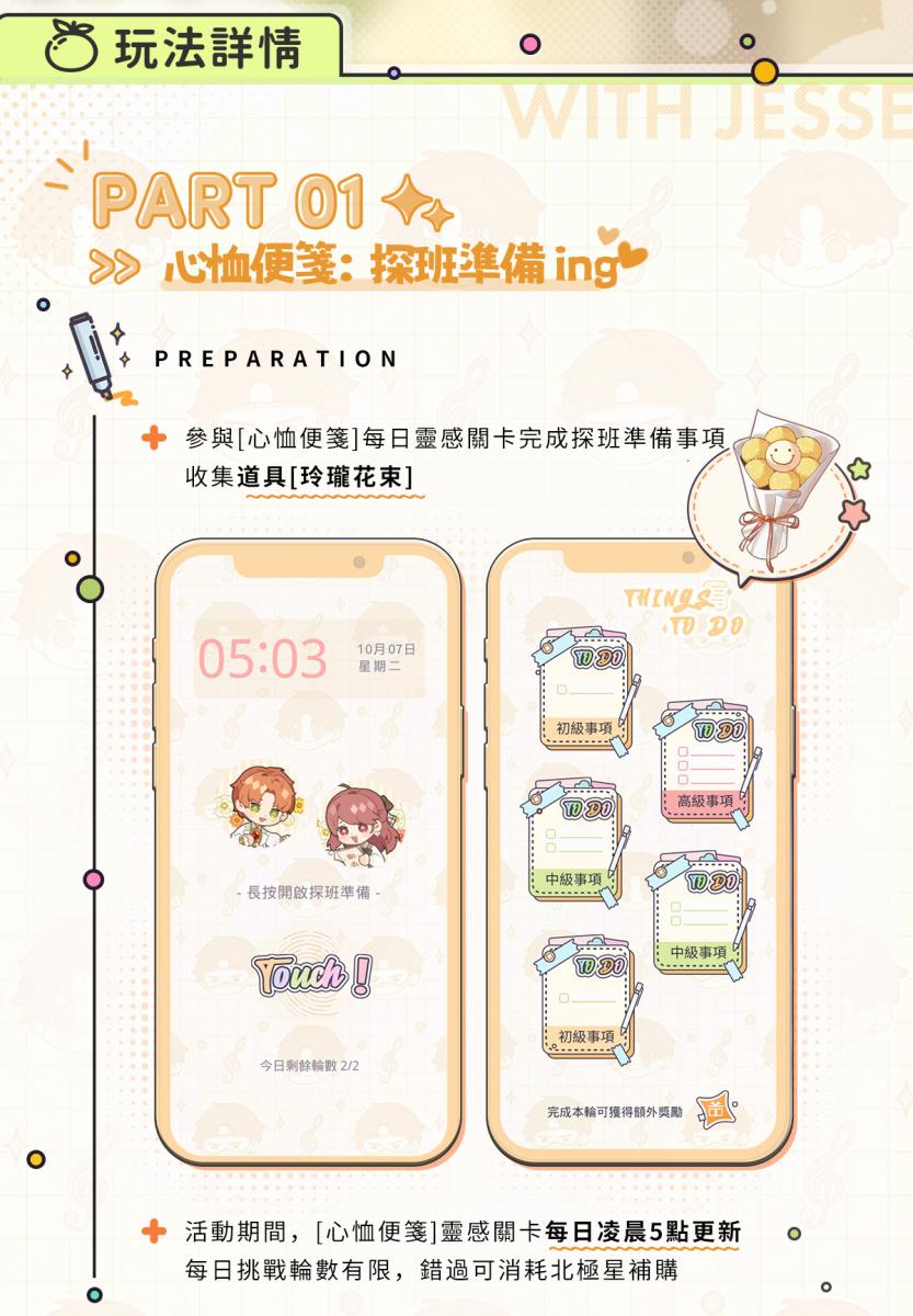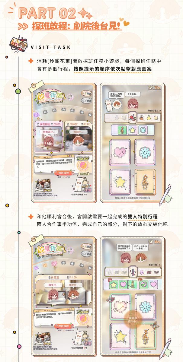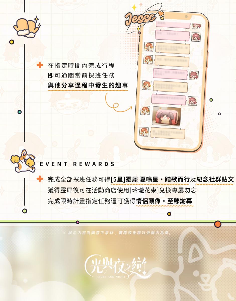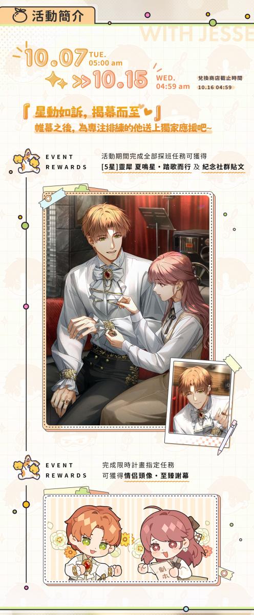 活動概要:星動如訴,揭幕而至—— 帷幕之後,為專注排練的他送上獨家應援吧。活動期間完成全部探班任務可獲得 [5星]靈犀 夏鳴星・踏歌而行 及紀念社群貼文。