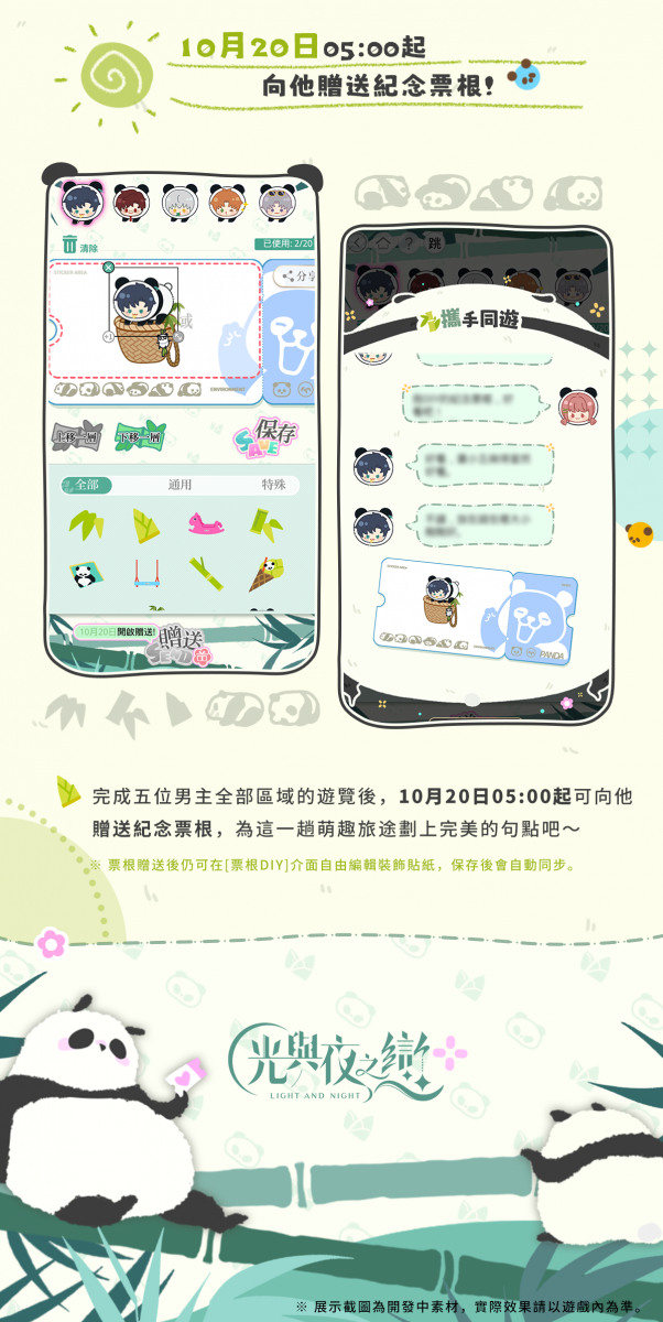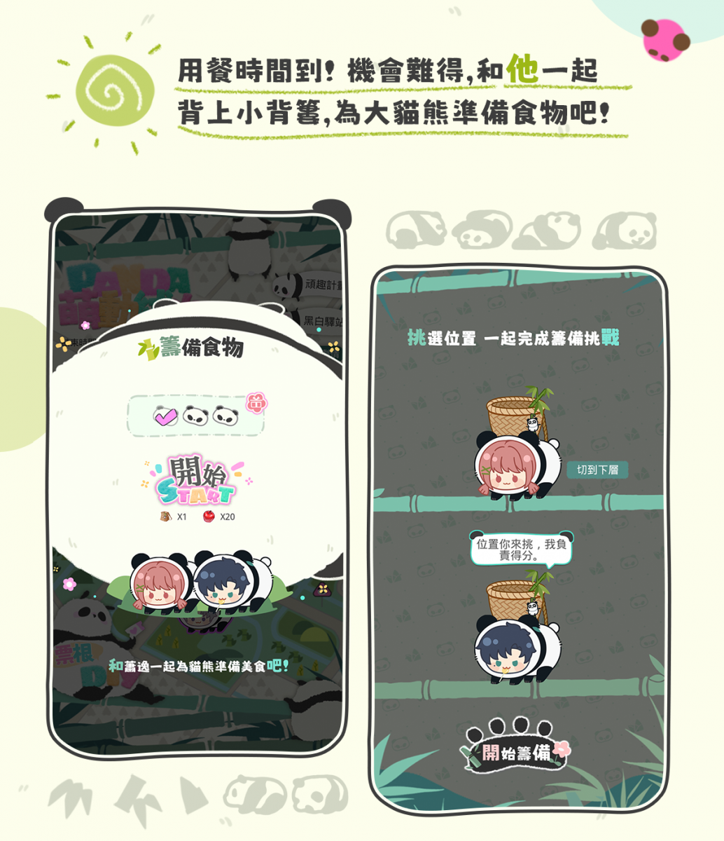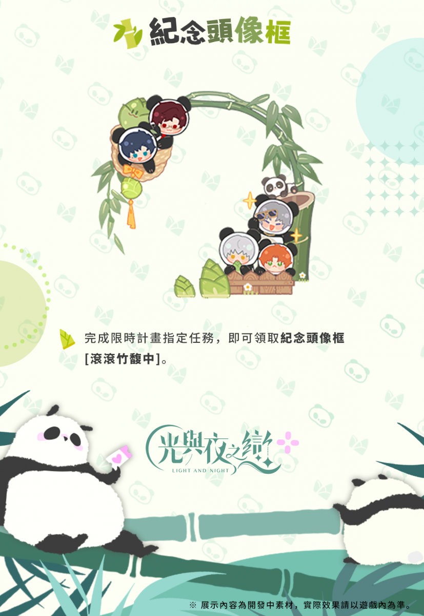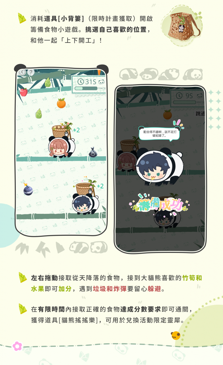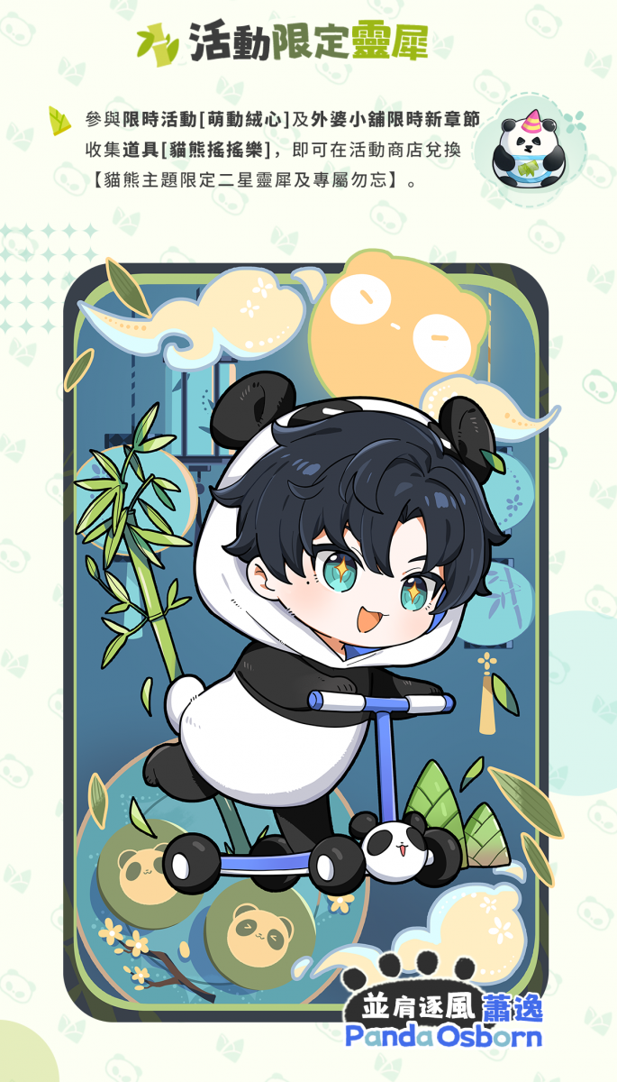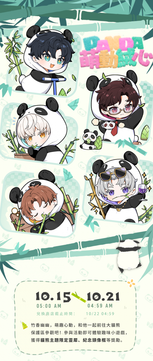 參與限時活動[萌動絨心]及外婆小舖限時新章節,收集道具[貓熊搖搖樂],即可在活動商店兌換【貓熊主題限定二星靈犀及專屬勿忘】── 蕭逸・並肩逐風、陸沉・閒日漫談、齊司禮・竹香吟味、查理蘇・杯盞相慶、夏鳴星・長日酣夢。