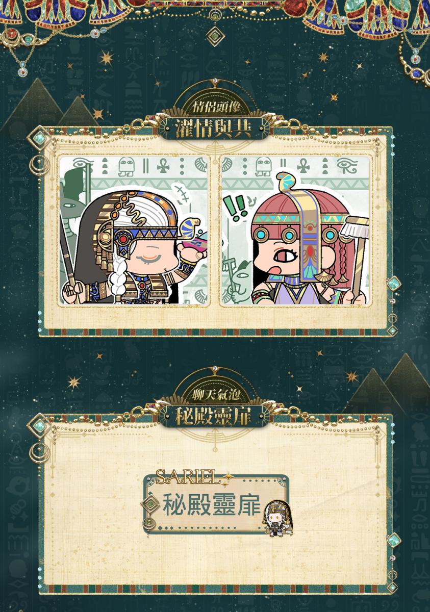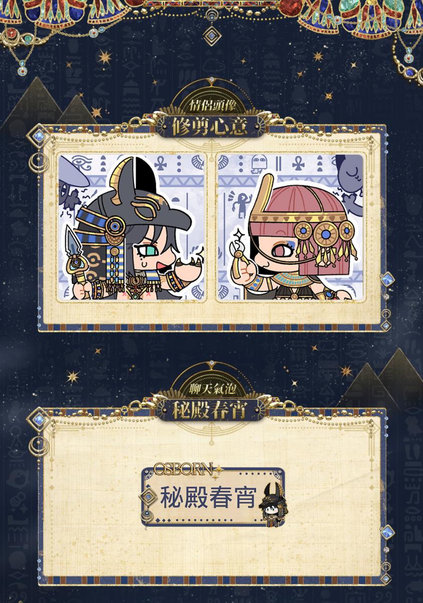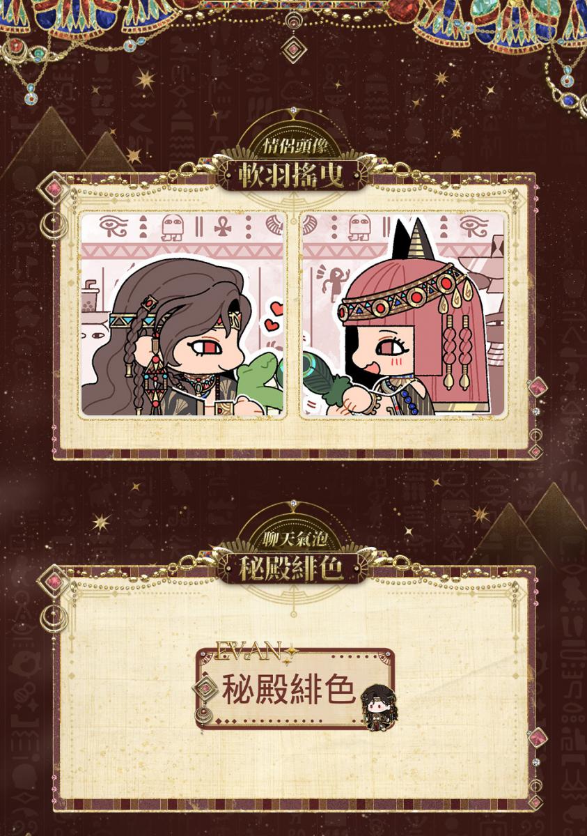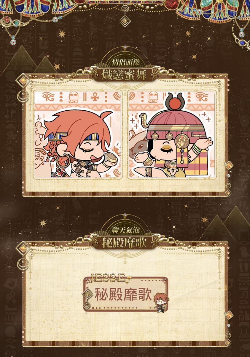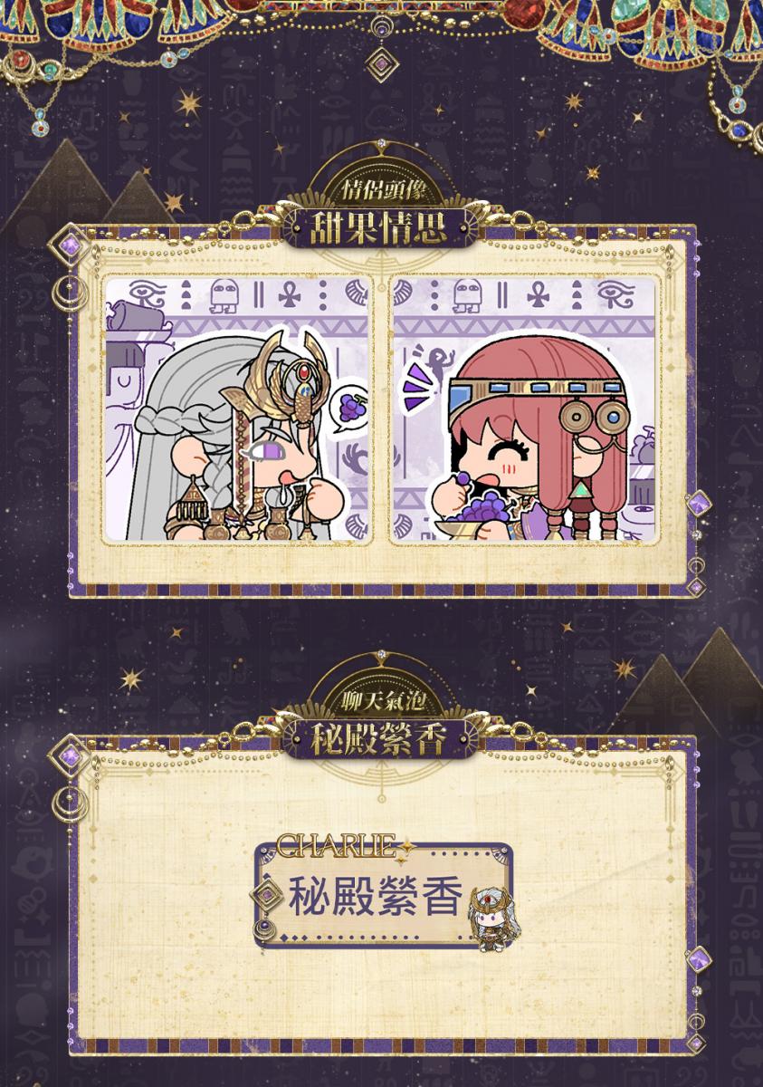 活動期間,將[琉沙煌夢]系列限定靈犀培養至二花,可在限時計畫處領取對應專屬聊天氣泡:[秘殿春宵] [秘殿緋色] [秘殿靈扉] [秘殿縈香] [秘殿靡歌]。