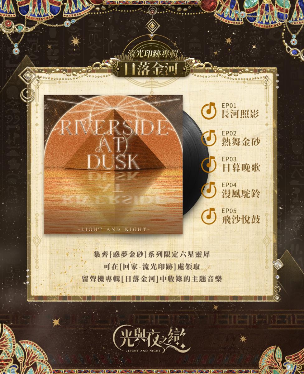 集齊[惑夢金砂]系列限定六星靈犀,可在[回家 - 流光印跡]處領取留聲機專輯[日落金河]中收錄的主題音樂[長河照影] [熱舞金砂] [日暮晚歌] [漫風駝鈴] [飛沙悅鼓] 。