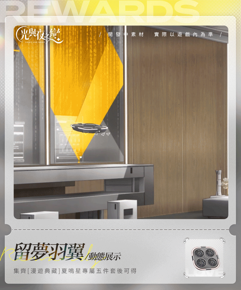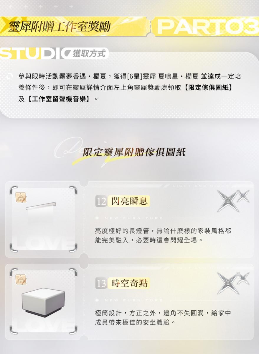 參與限時活動羈夢香遇・櫚夏,獲得[6星]靈犀 夏鳴星・渡夢 並達成一定培養條件後,即可在靈犀詳情介面左上角靈犀獎勵處領取附贈【限定傢俱圖紙】及【工作室留聲機音樂】。