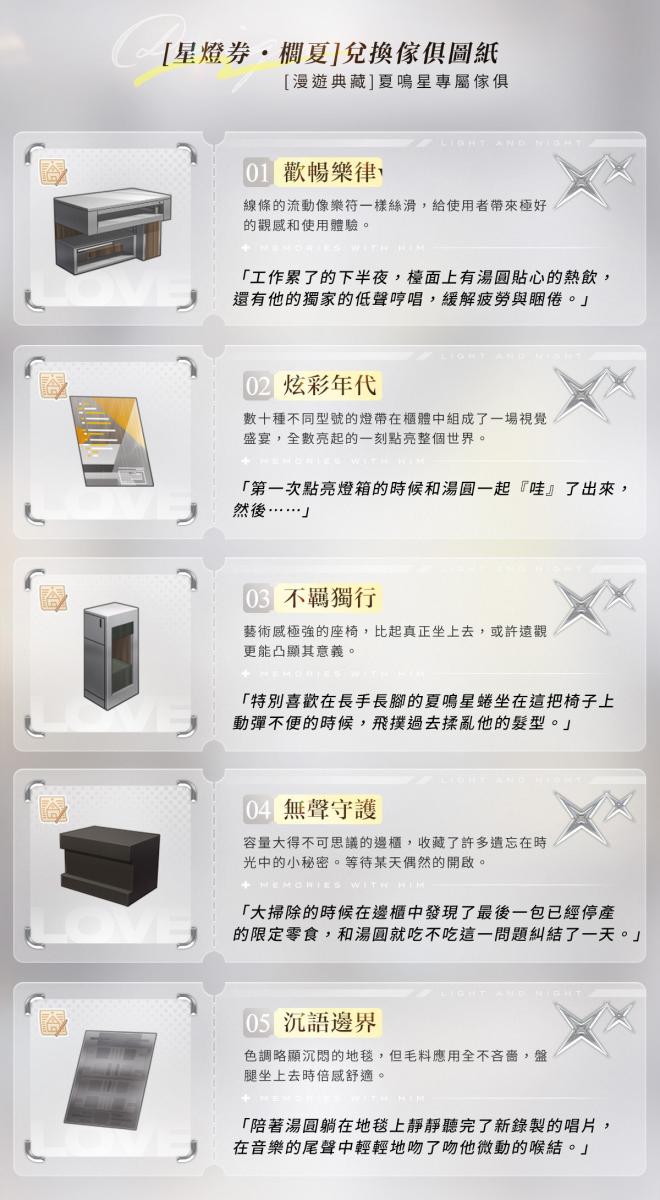 參與限時活動羈夢香遇・櫚夏,收集道具[星燈券・櫚夏]即可在活動商店兌換[漫遊典藏]系列夏鳴星專屬傢俱設計圖紙,擁有設計圖紙後即可在工作室中消耗傢俱製作材料以獲取對應傢俱。