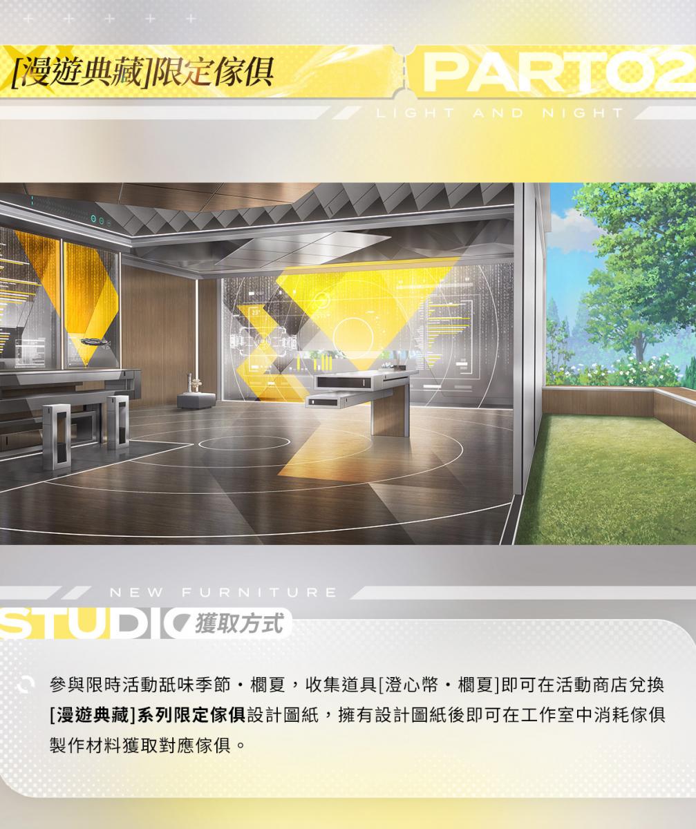參與限時活動舐味季節・櫚夏,收集道具[澄心幣・櫚夏]即可在活動商店兌換漫遊典藏系列限定傢俱設計圖紙,擁有設計圖紙後即可在工作室中消耗傢俱製作材料獲取對應傢俱。