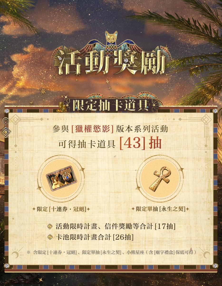 參加[獵權慾影]版本系列活動,可得抽卡道具[43抽],詳情如下: