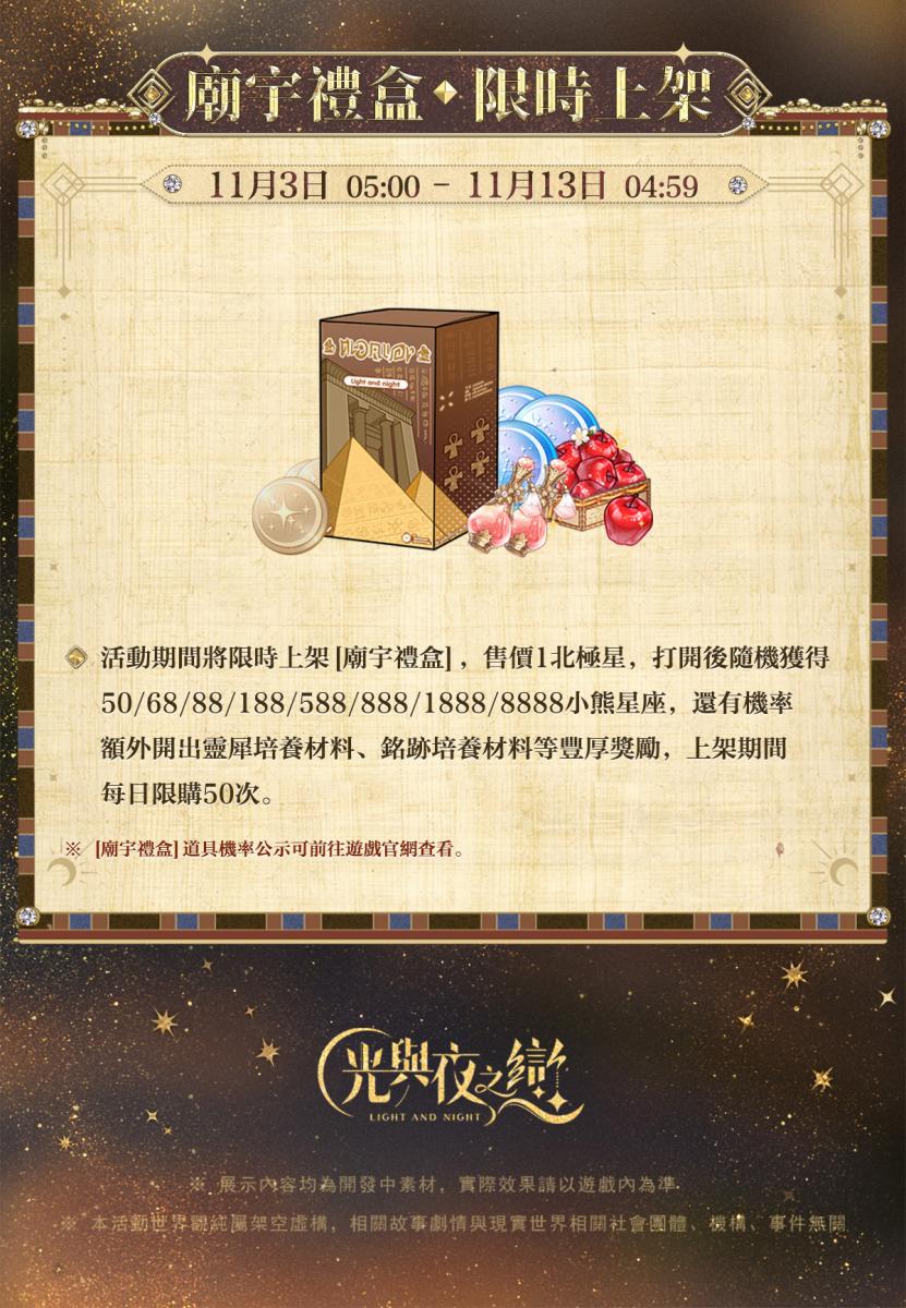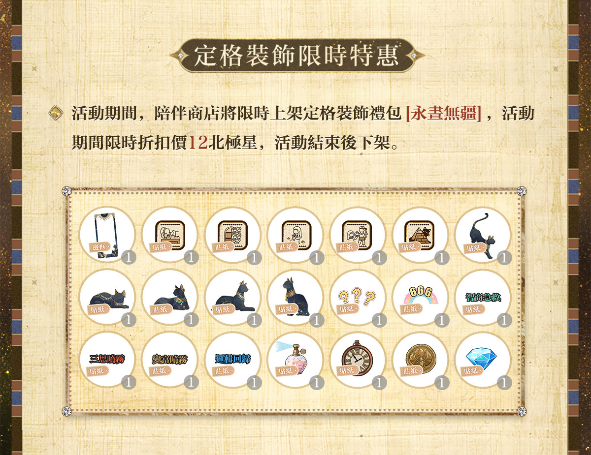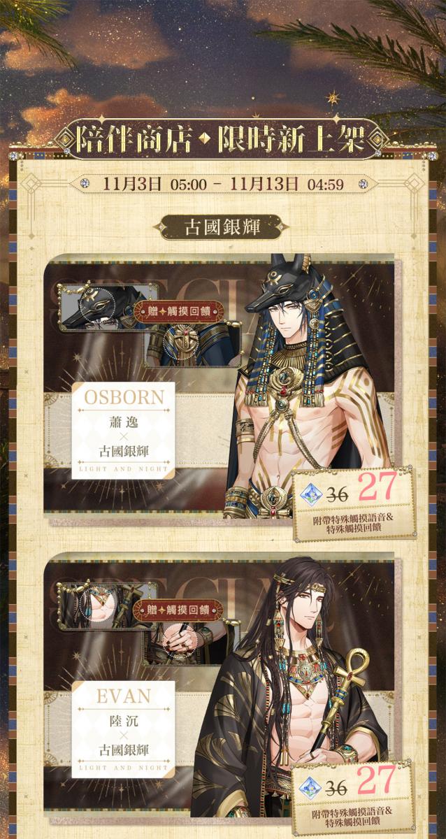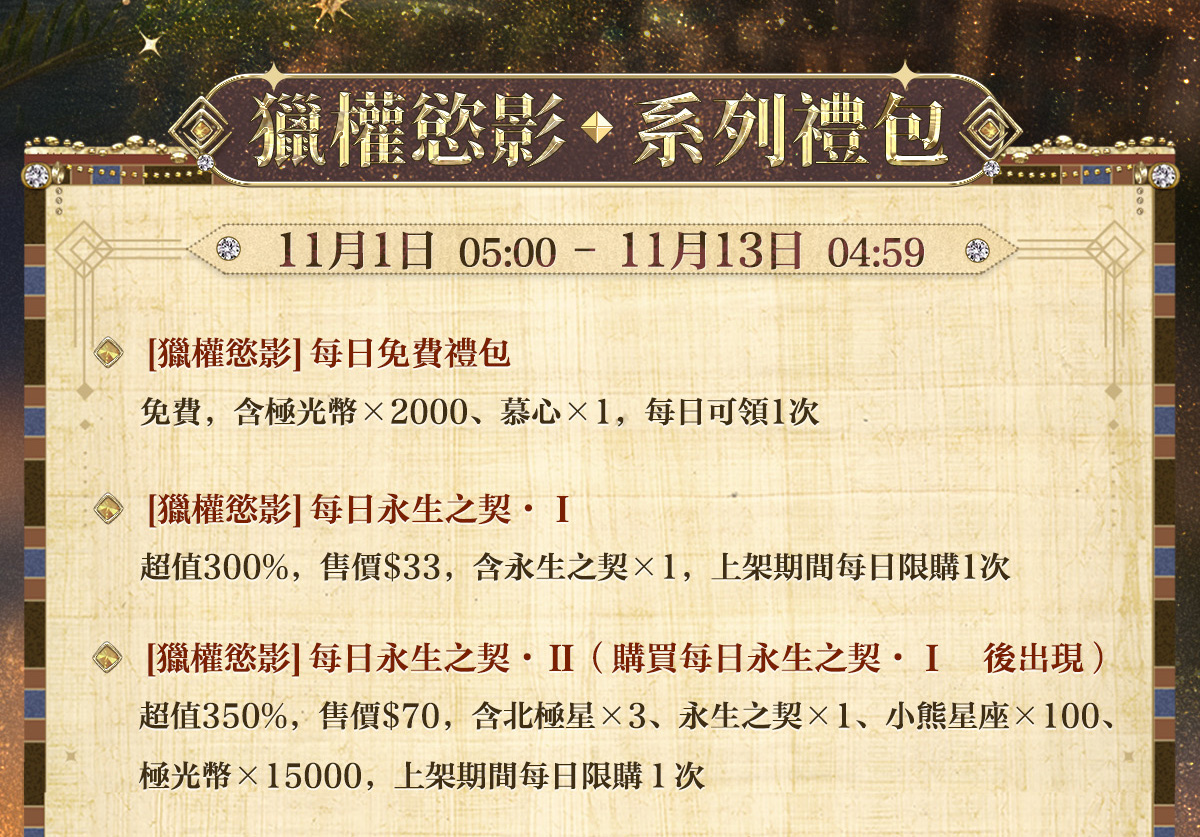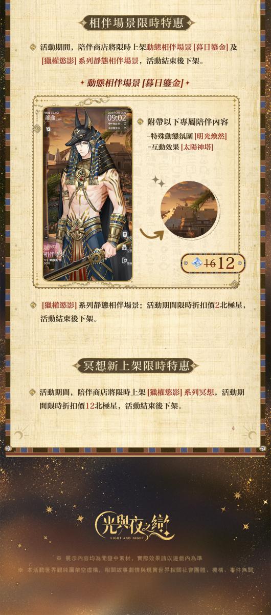 ✦ 11月1日 05:00 - 11月13日 04:59期間,陪伴商店將限時上新[古國銀輝]系列百搭服飾、定格裝飾禮包[永晝無疆]、動態相伴場景[暮日鎏金]及[獵權慾影]系列靜態相伴場景、[獵權慾影]系列冥想,活動結束後下架。