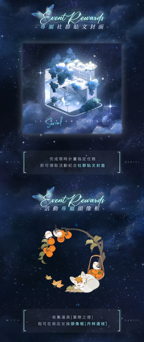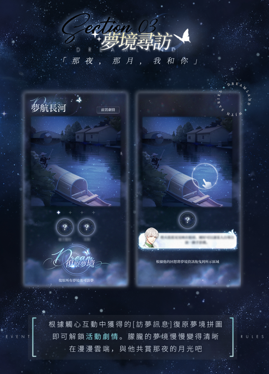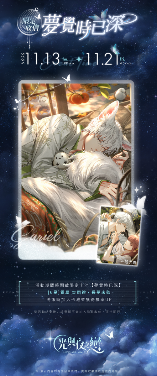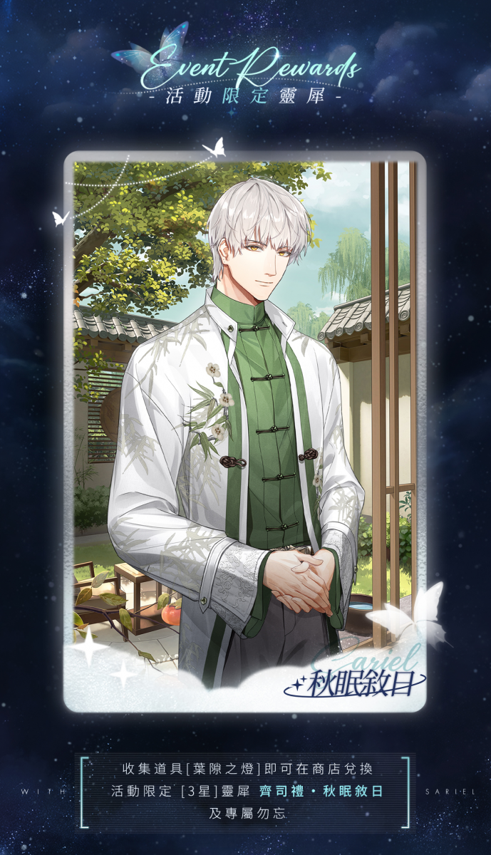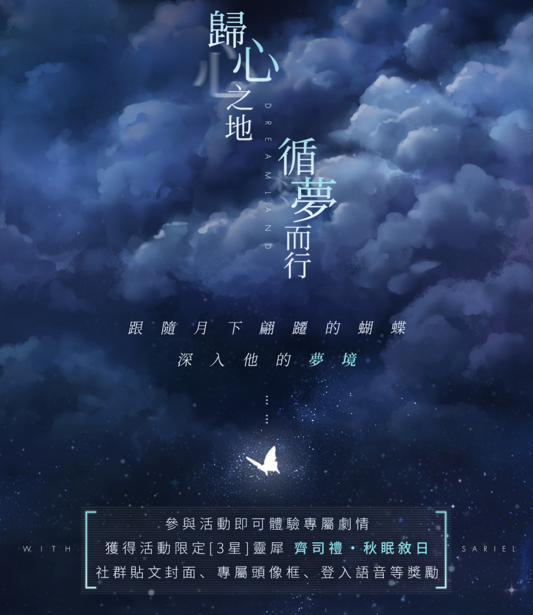 活動說明:歸心之地,循夢而行。跟隨月下翩躚的蝴蝶,深入他的夢境……參與活動即可體驗專屬劇情,獲得活動限定 [3星]靈犀 齊司禮・秋眠敘日,社群貼文封面、專屬頭像框、登入語音等獎勵。