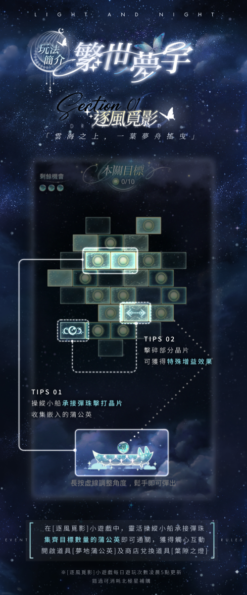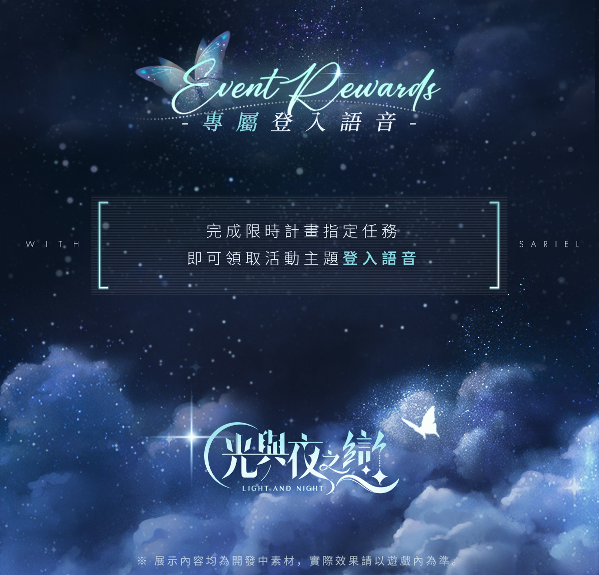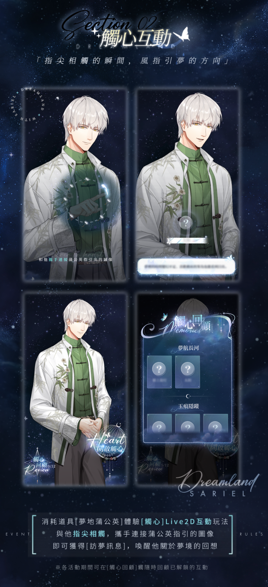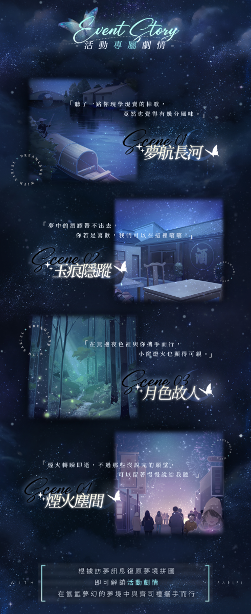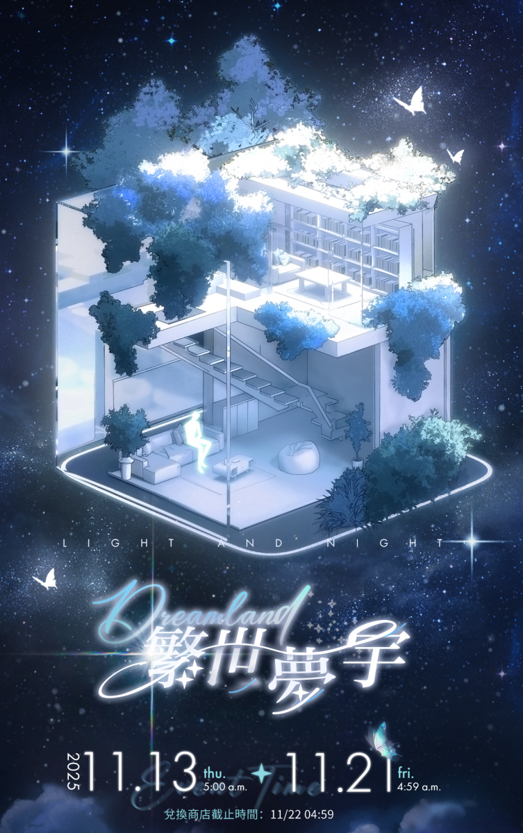 活動說明:歸心之地,循夢而行。跟隨月下翩躚的蝴蝶,深入他的夢境……參與活動即可體驗專屬劇情,獲得活動限定 [3星]靈犀 齊司禮・秋眠敘日,社群貼文封面、專屬頭像框、登入語音等獎勵。