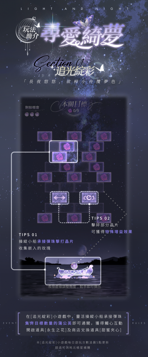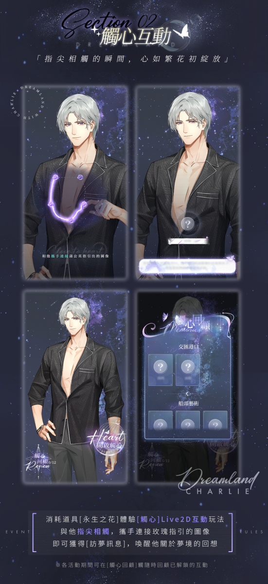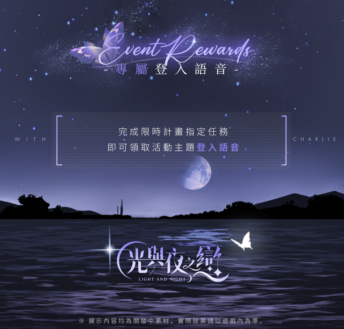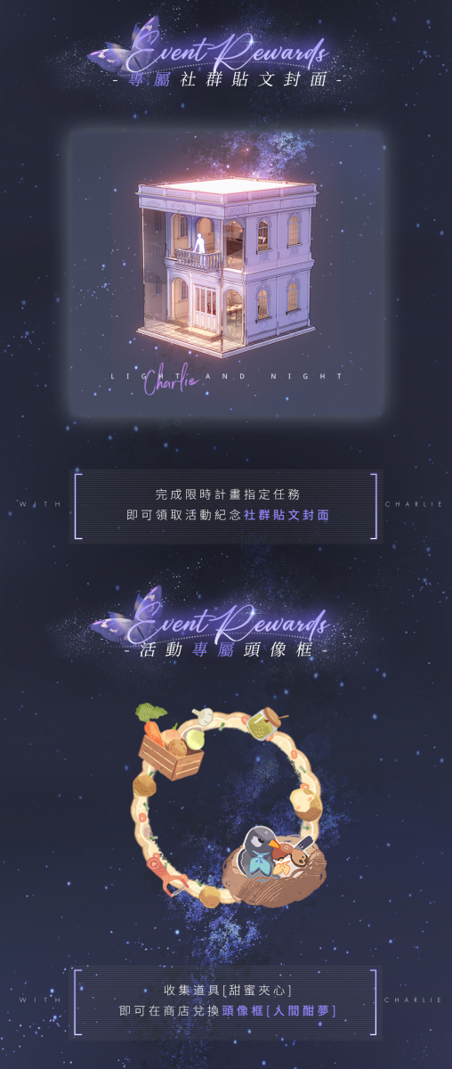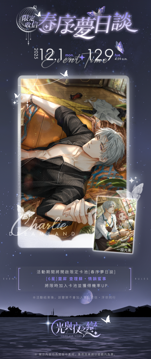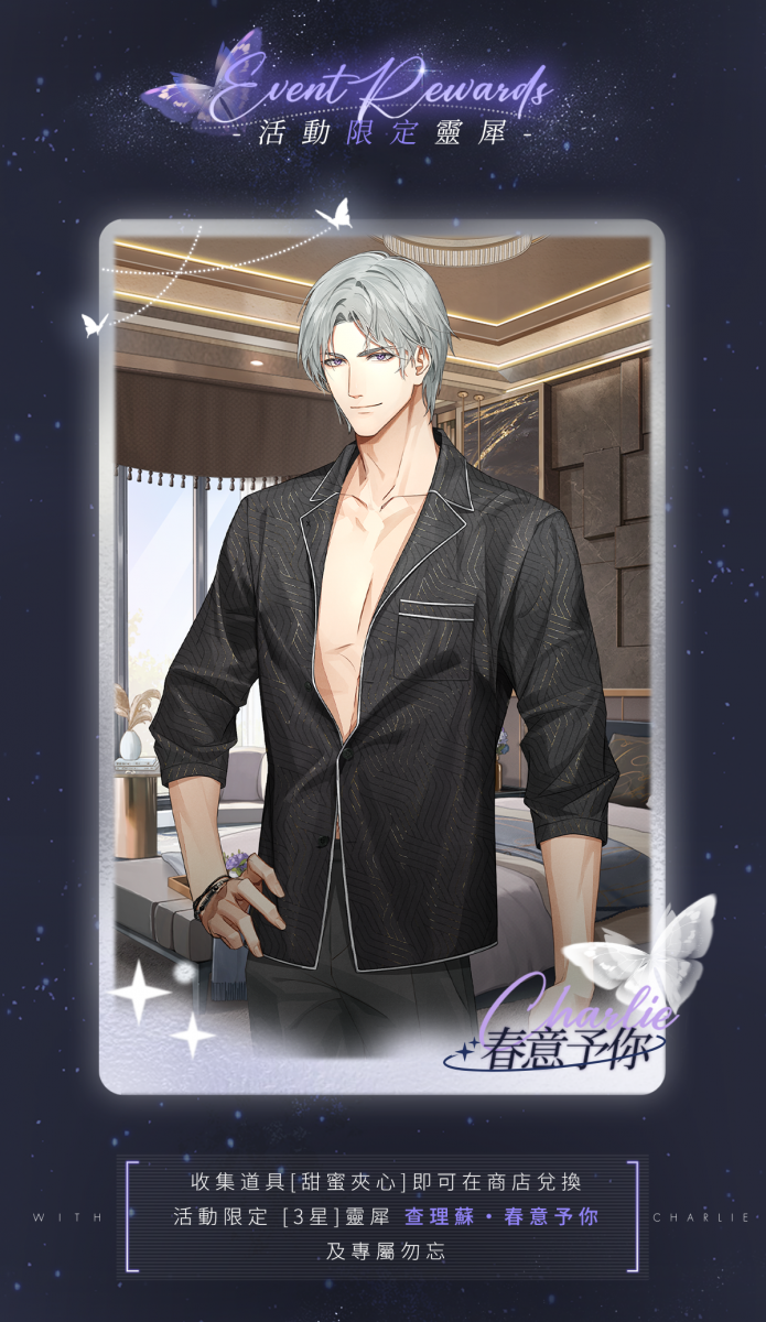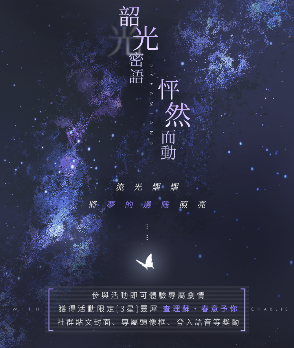 活動說明:韶光密語,怦然而動。流光熠熠,將夢的邊陲照亮……參與活動即可體驗專屬劇情,獲得活動限定 [3星]靈犀 查理蘇・春意予你 、社群貼文封面、專屬頭像框、登入語音等獎勵。