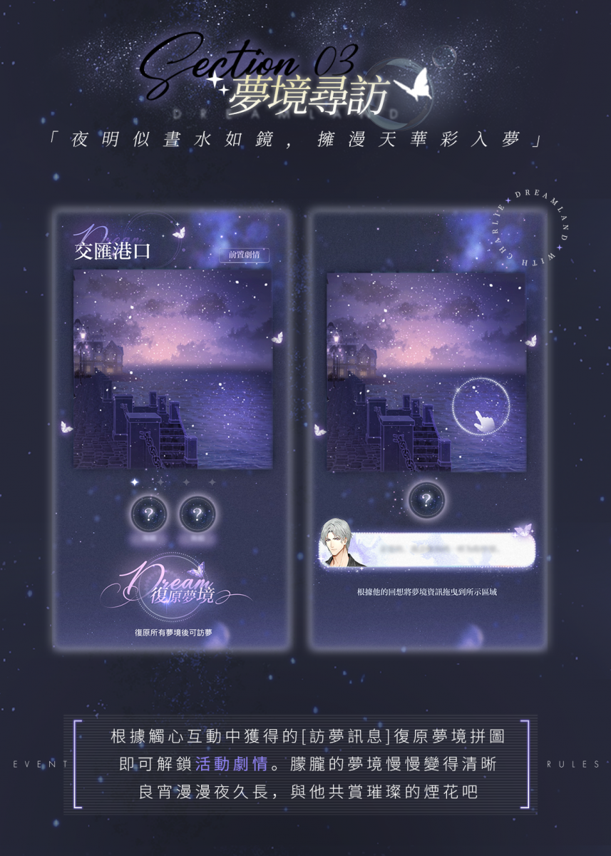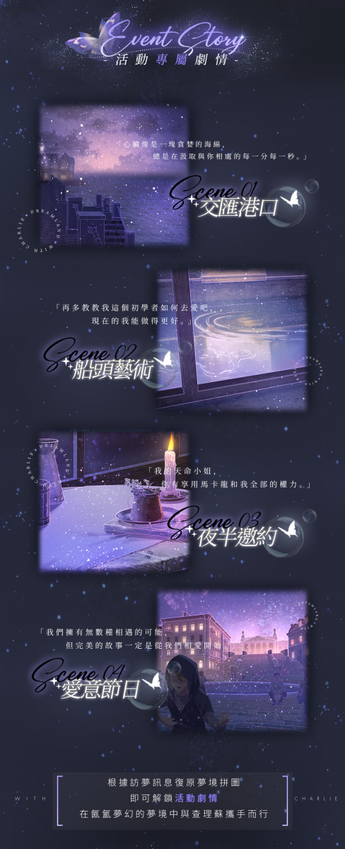 根據訪夢資訊復原夢境拼圖,即可解鎖活動劇情,在氤氳夢幻的夢境中,與查理蘇攜手而行。