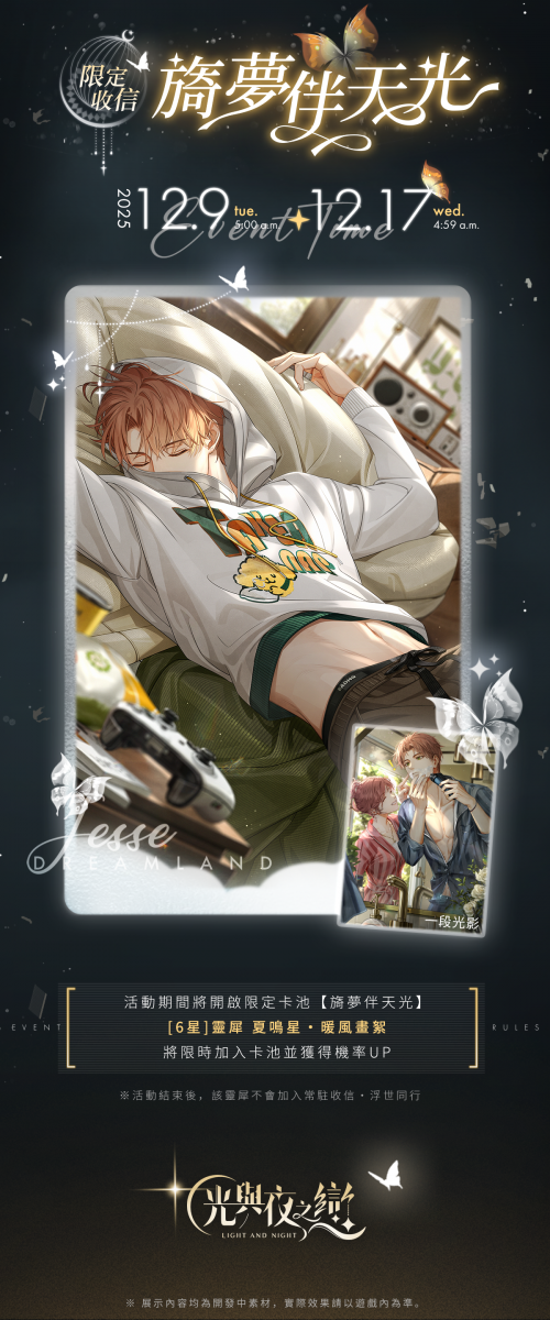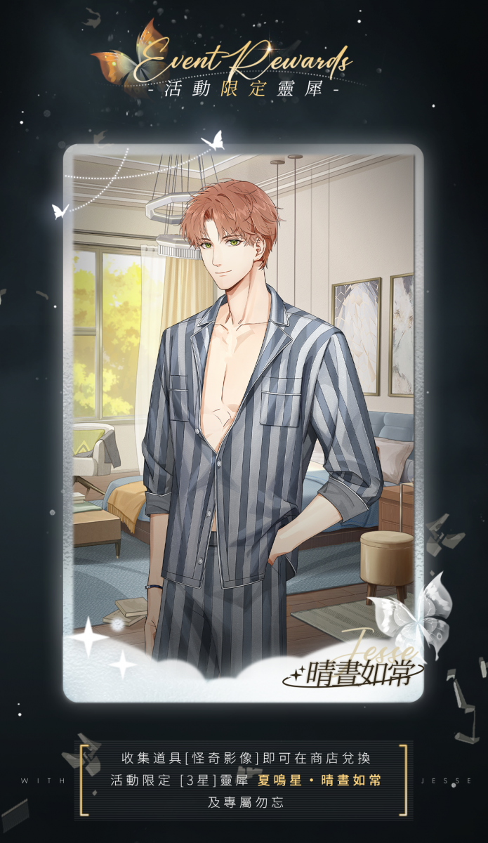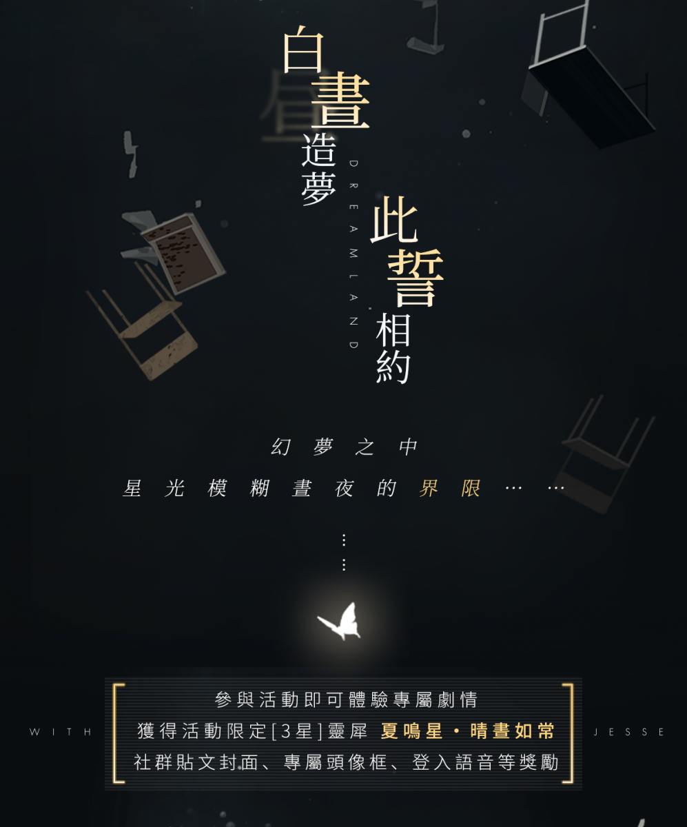 活動說明:白晝造夢,此誓相約。幻夢之中,星光模糊晝夜的界限……參與活動即可體驗專屬劇情,獲得活動限定 [3星]靈犀 夏鳴星・晴晝如常 、社群貼文封面、專屬頭像框、登入語音等獎勵。