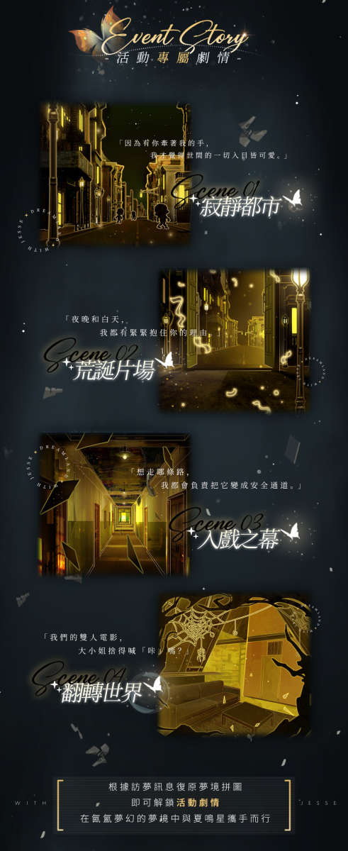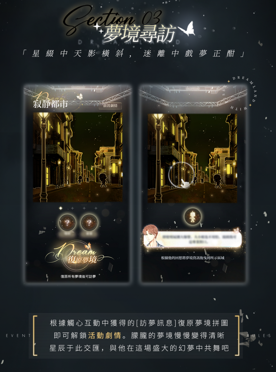 根據訪夢資訊復原夢境拼圖,即可解鎖活動劇情,在氤氳夢幻的夢境中,與夏鳴星攜手而行。