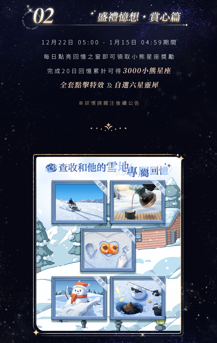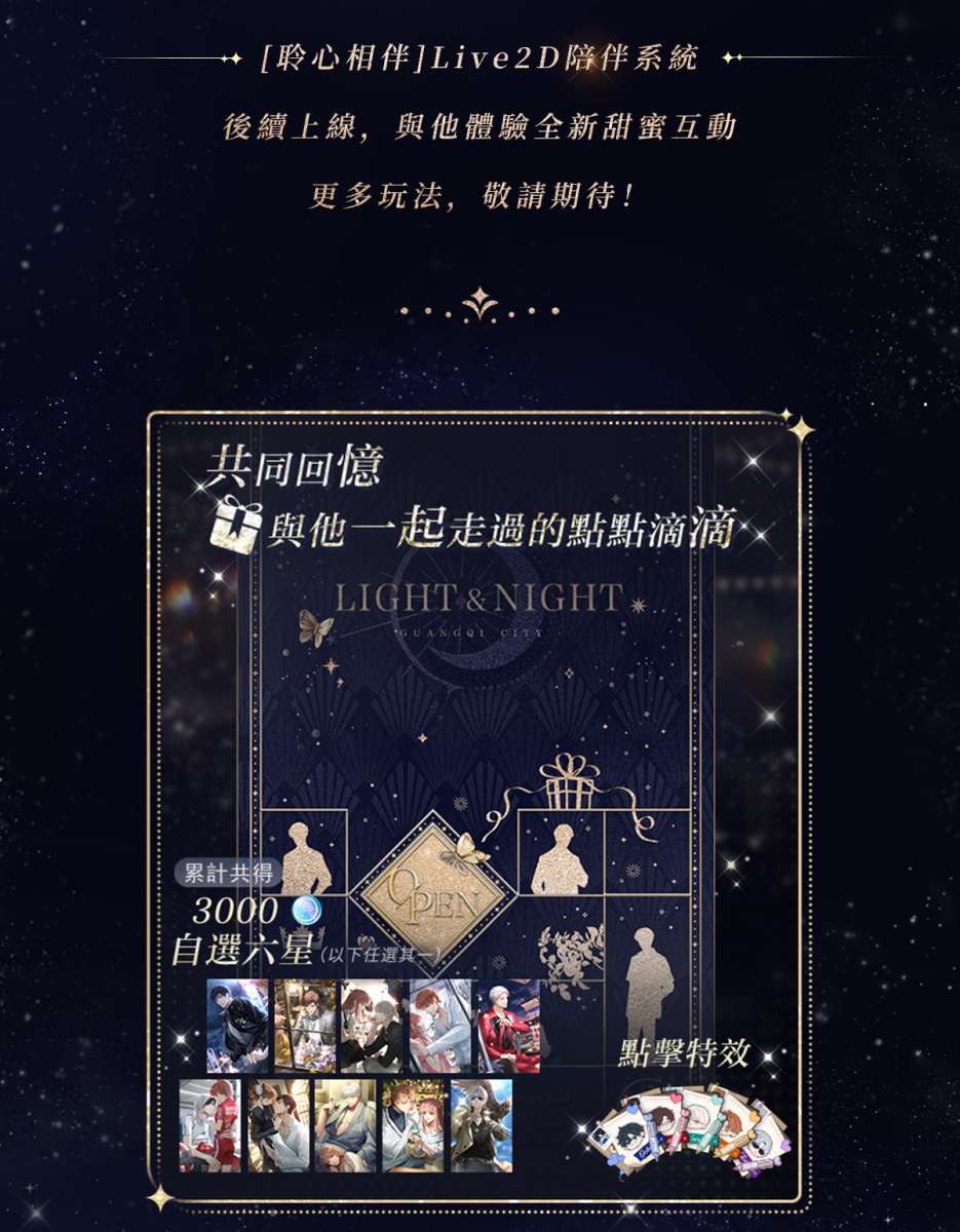 ⭐ 參與光夜盛典即可獲得自選男主制服套裝、自選六星靈犀、全套點擊特效、紀念牆繪&動態憶旅、視訊電話、3000+小熊星座等超豪華獎勵,更有豐富回饋活動!
