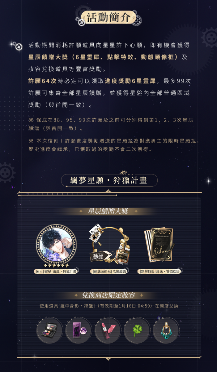※ 本次復刻Ⅰ許願進度獎勵贈送的星願瓶為對應男主的限時星願瓶,歷史進度會繼承,已獲取過的獎勵不會二次獲得。