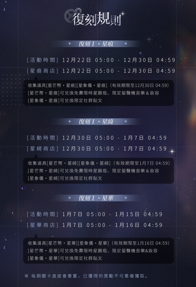 本次復刻Ⅰ中,三期分別對應不同的兌換道具[星芒幣・星痕/星綺/星華]、[星象儀・星痕/星綺/星華],使用有效期限分別截止至【單期兌換商店關閉】,請注意及時安排使用。
