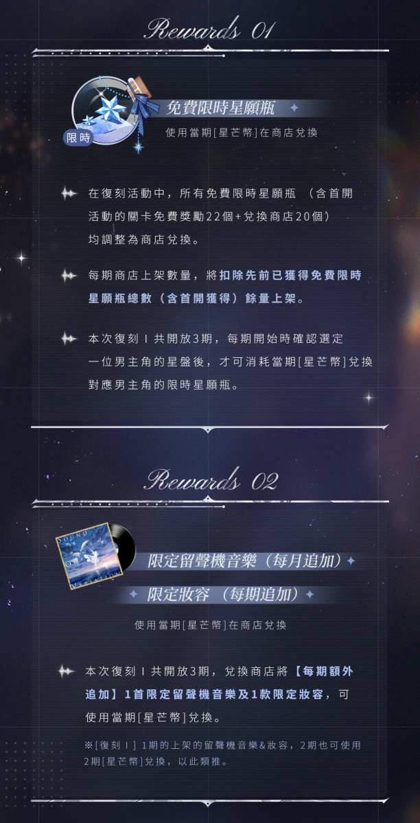 ③ 本次復刻Ⅰ共開放3期,每期開始時確認選定一位男主的星盤後,才可消耗當期[星芒幣]兌換對應男主的限時星願瓶。