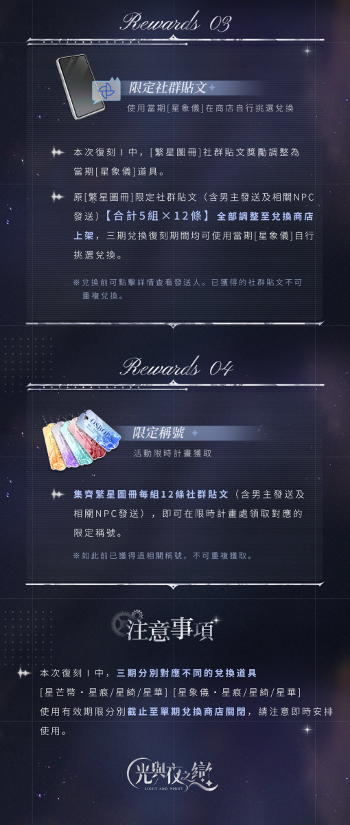 本次復刻Ⅰ中,[繁星圖冊]社群貼文獎勵調整為當期[星象儀]道具,原[繁星圖冊]限定社群貼文(含男主發送及相關NPC發送)【合計5組×12則】全部調整至兌換商店上架,三期兌換復刻期間均可使用當期[星象儀]自行挑選兌換。