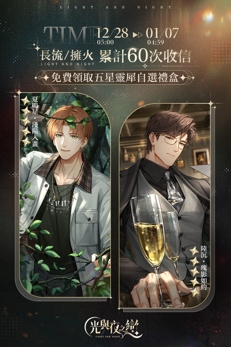 > 活動說明:活動期間在限定收信[光陰的倒影・長流/擁火]累計收信達60次,即可領取[光陰倒影・限時自選]五星靈犀自選禮盒,在 [5星]靈犀 夏鳴星・淺陽入畫、[5星]靈犀 陸沉・瑰影如約 中【自選一張】。