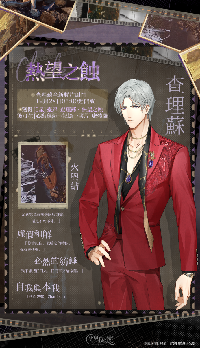 ⭐ 在限定收信[光陰的倒影・長流/擁火]中獲得[6星]靈犀 查理蘇・熱望之蝕 後,可在[心動邂逅→記憶→膠片]處體驗全新膠片劇情。
