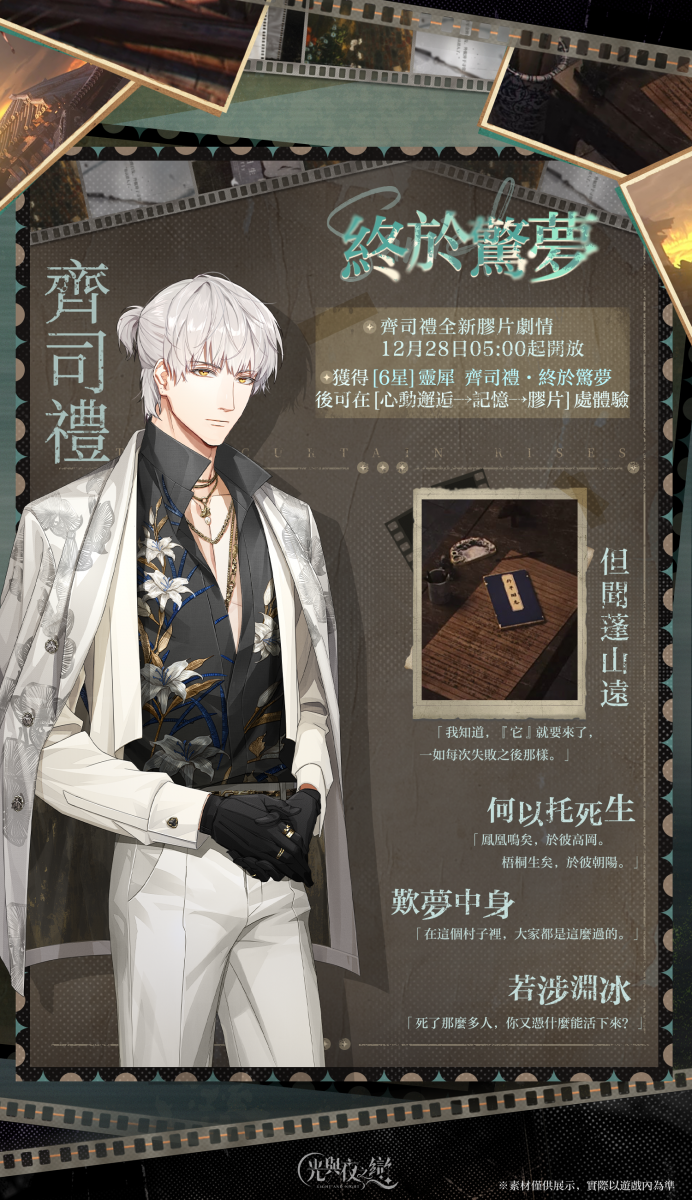 ⭐ 在限定收信[光陰的倒影・長流/擁火]中獲得 [6星]靈犀 齊司禮・終於驚夢 後,可在[心動邂逅→記憶→膠片]處體驗全新膠片劇情。