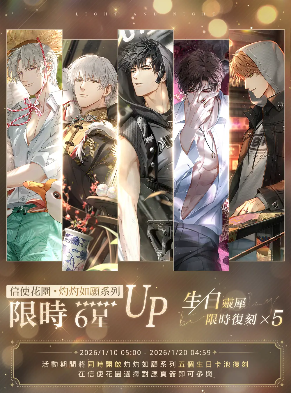 ⭐ 復刻說明:活動期間將【同時開啟】灼灼如願系列五個生日卡池復刻,在信使花園選擇對應分頁即可參與。