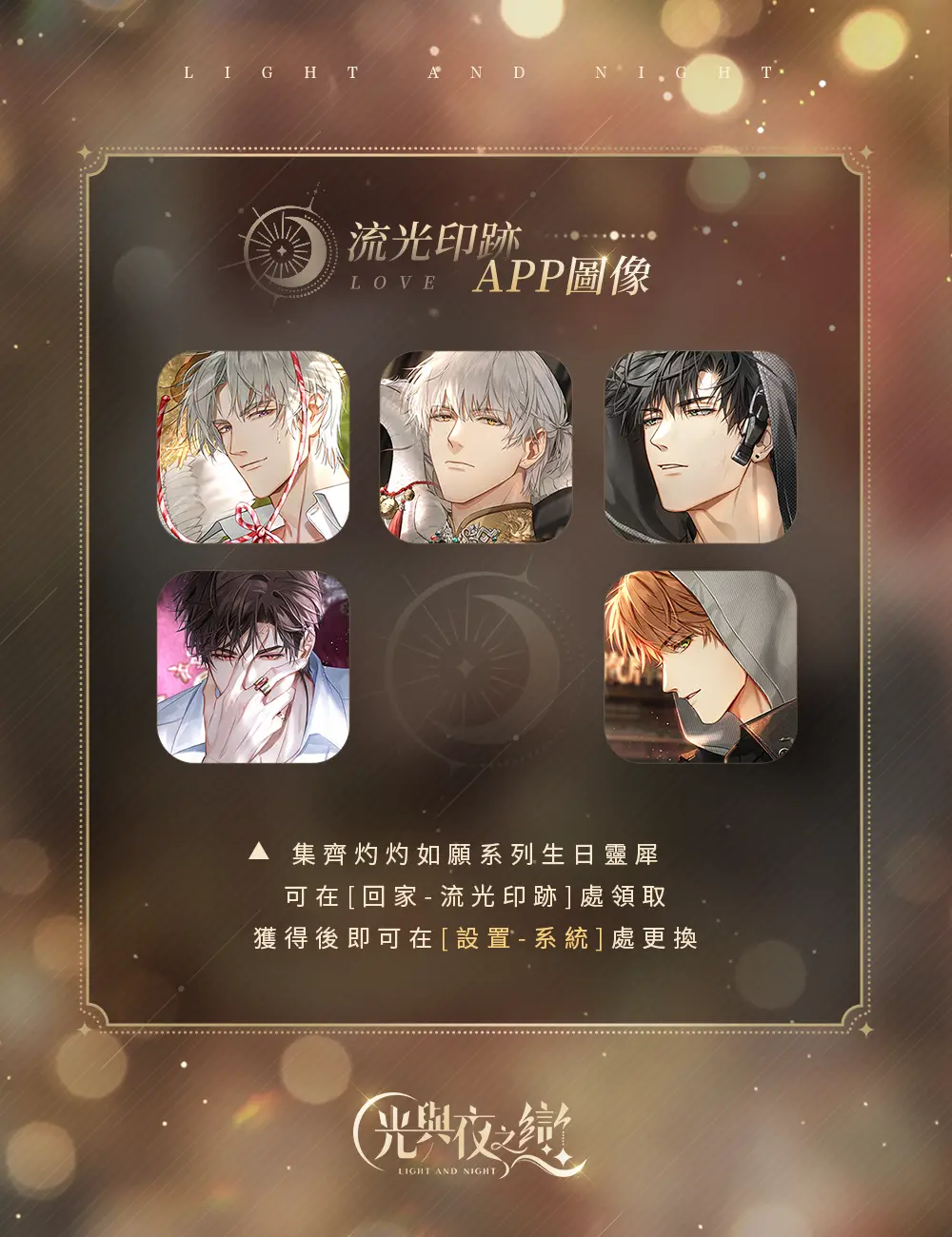 集齊灼灼如願系列生日靈犀,可在[回家-流光印跡]處領取限定APP圖像×5,可在[設置-系統]處更換。