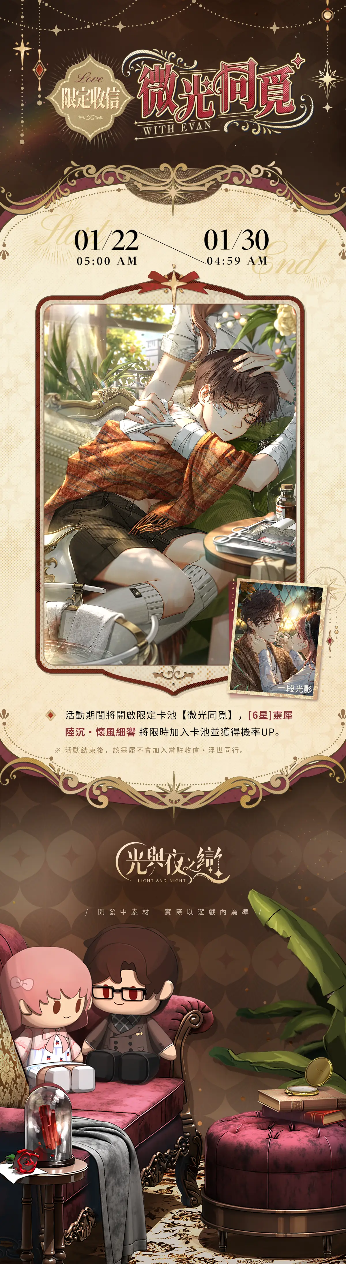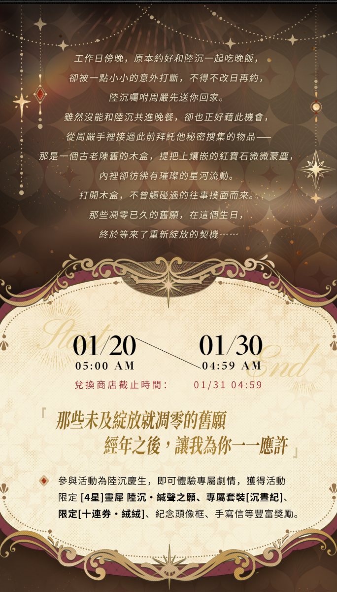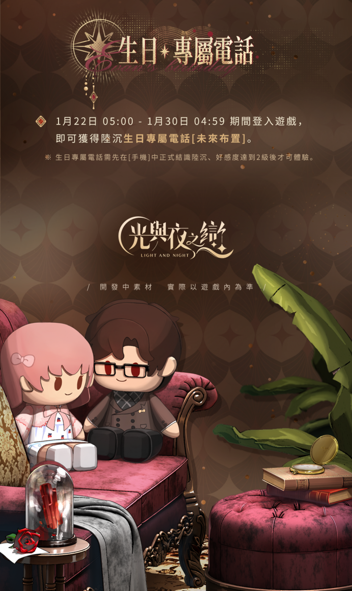 1月22日 05:00 - 1月30日 04:59 期間登入遊戲,即可獲得陸沉生日專屬電話[未來布置]。