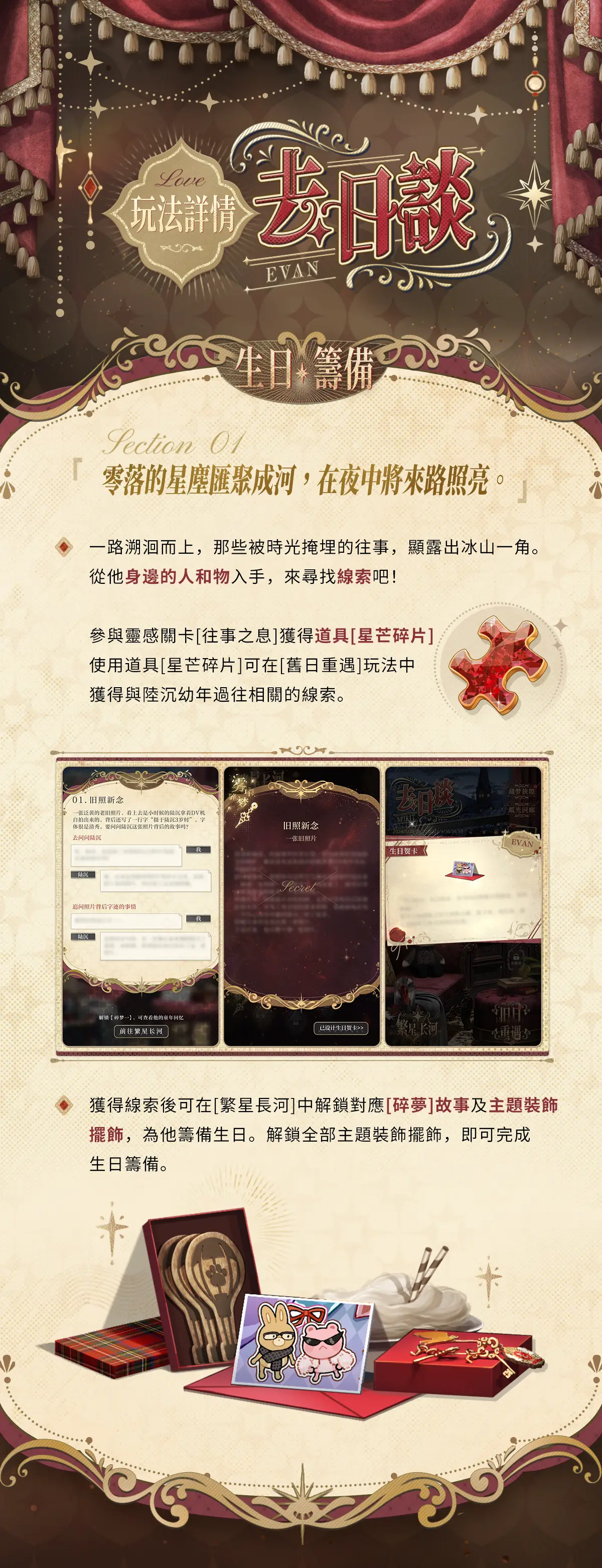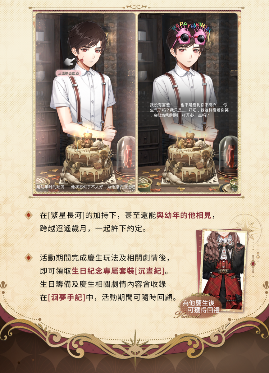 完成慶生玩法及相關劇情後,即可領取生日紀念專屬套裝[沉晝紀],收集道具[霧光領夾]可在活動商店兌換套裝換色配件及限定耳飾。