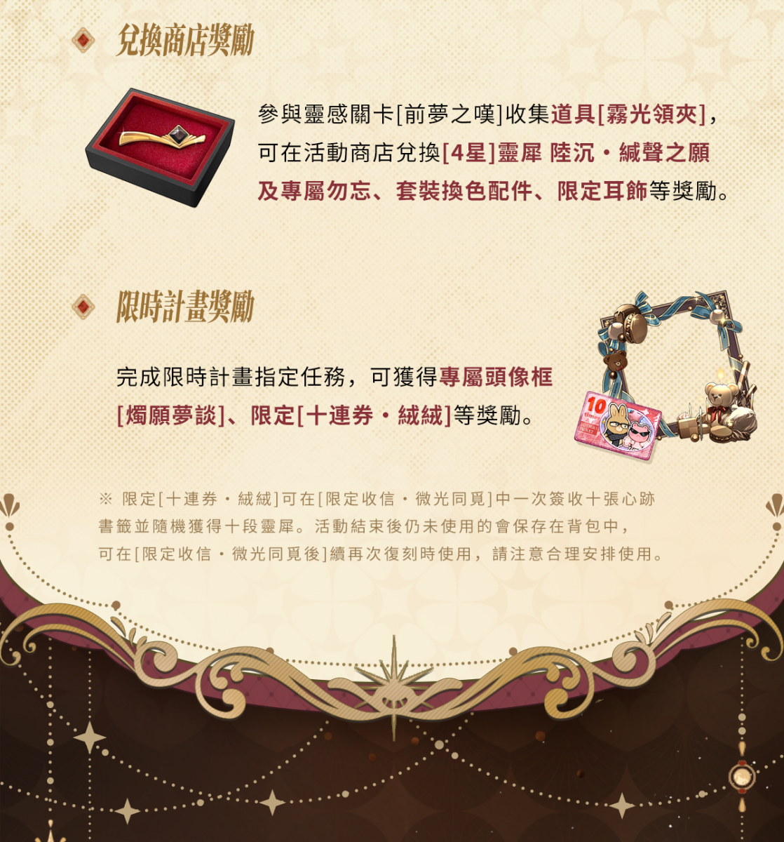 參與[前夢之嘆]靈感關卡收集道具[霧光領夾],即可在活動商店兌換 [4星]靈犀 陸沉・緘聲之願 及專屬勿忘。