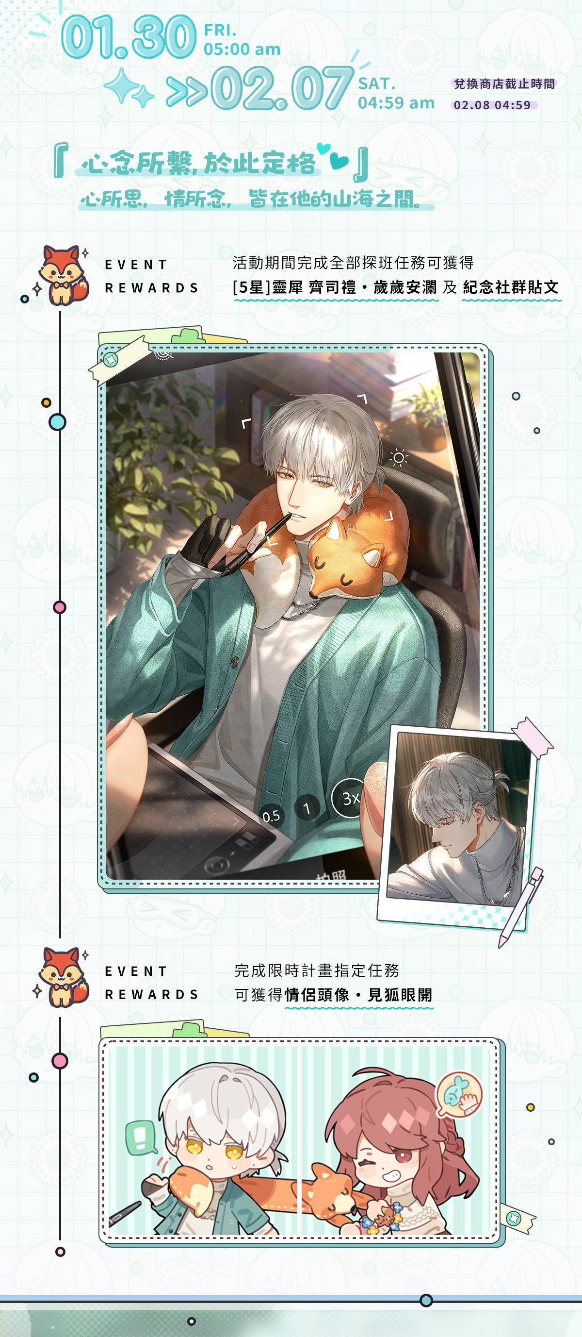 ⭐ 活動概要:心念所繫,於此定格——心所思,情所念,皆在他的山海之間。活動期間完成全部探班任務即可獲得 [5星]靈犀 齊司禮・歲歲安瀾 及紀念社群貼文。