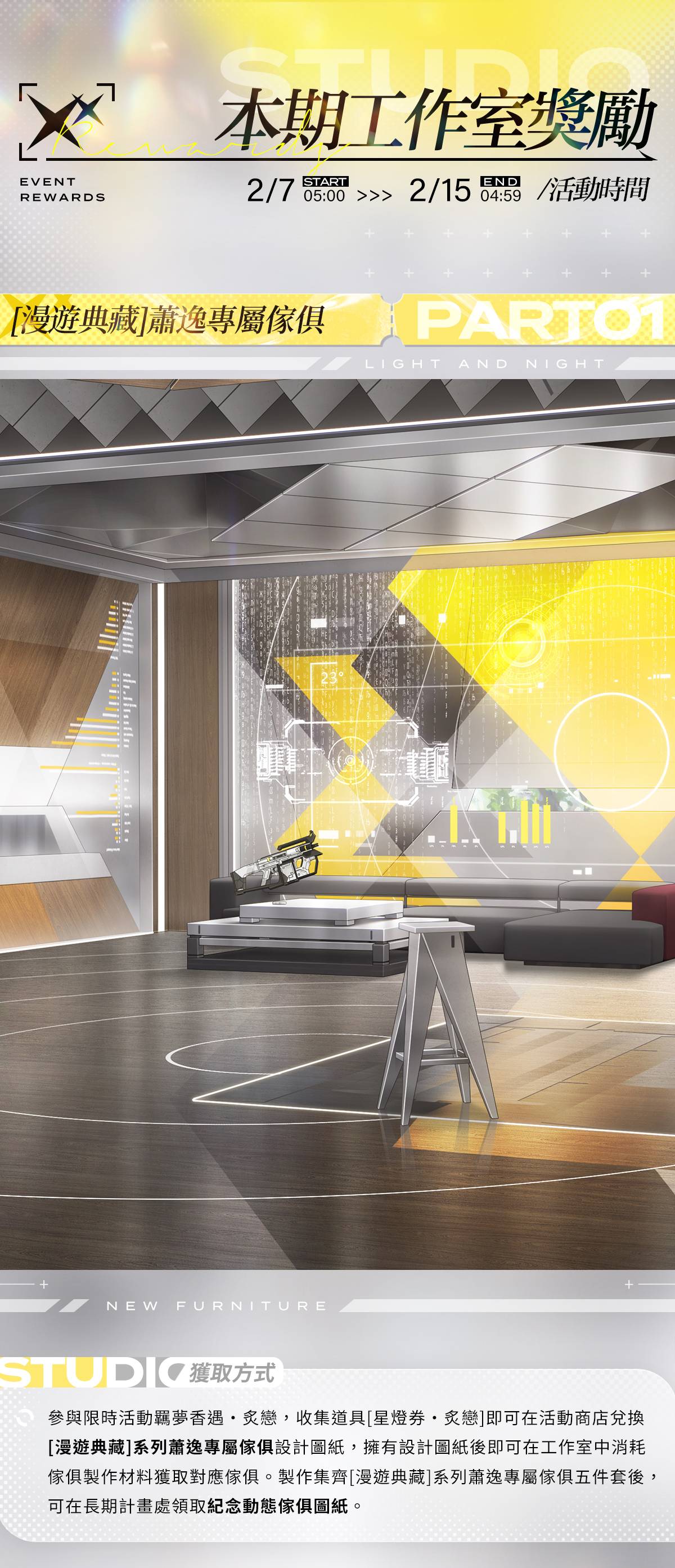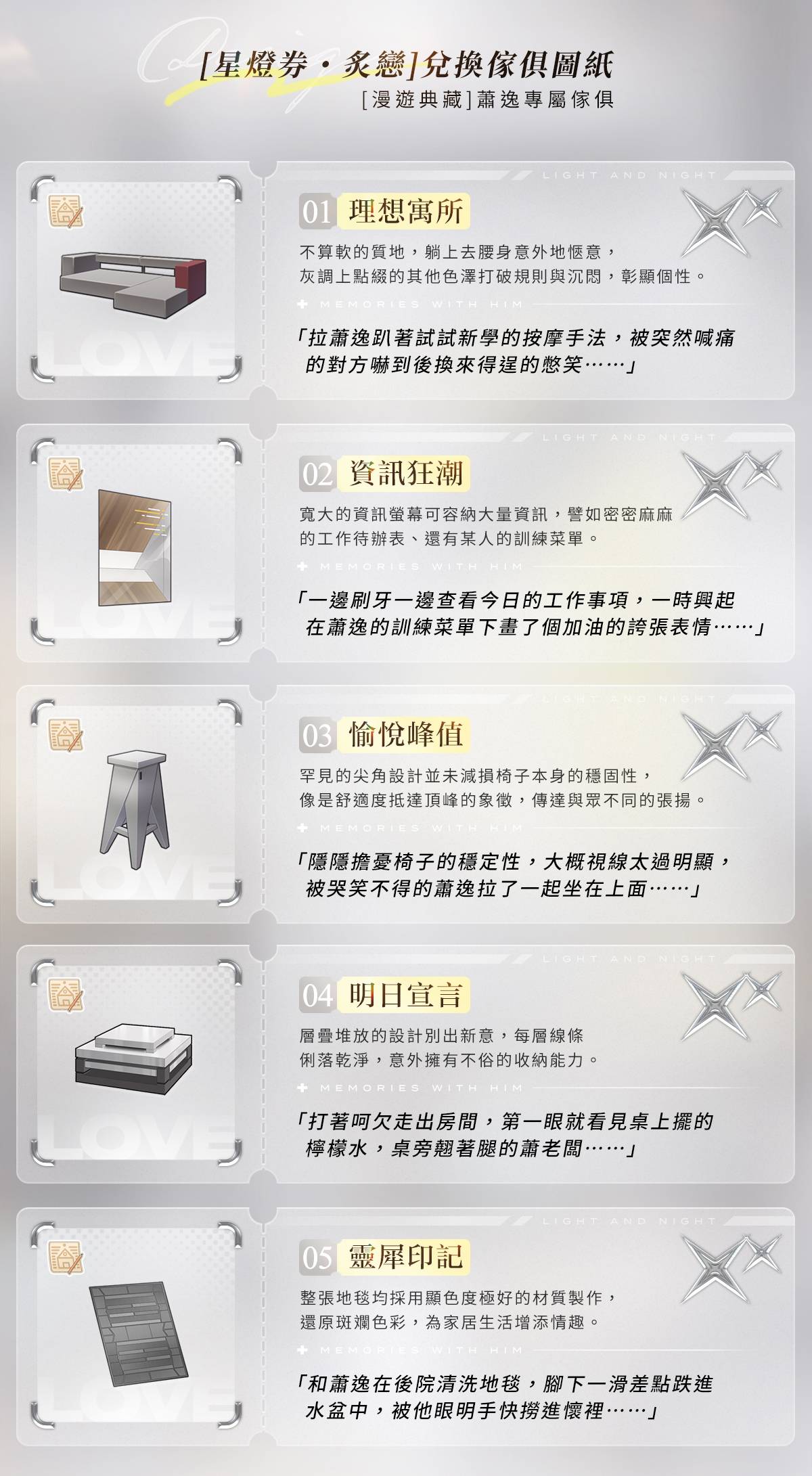 製作集齊[漫遊典藏]系列蕭逸專屬傢俱五件套後,可在長期計畫處領取紀念動態傢俱圖紙。