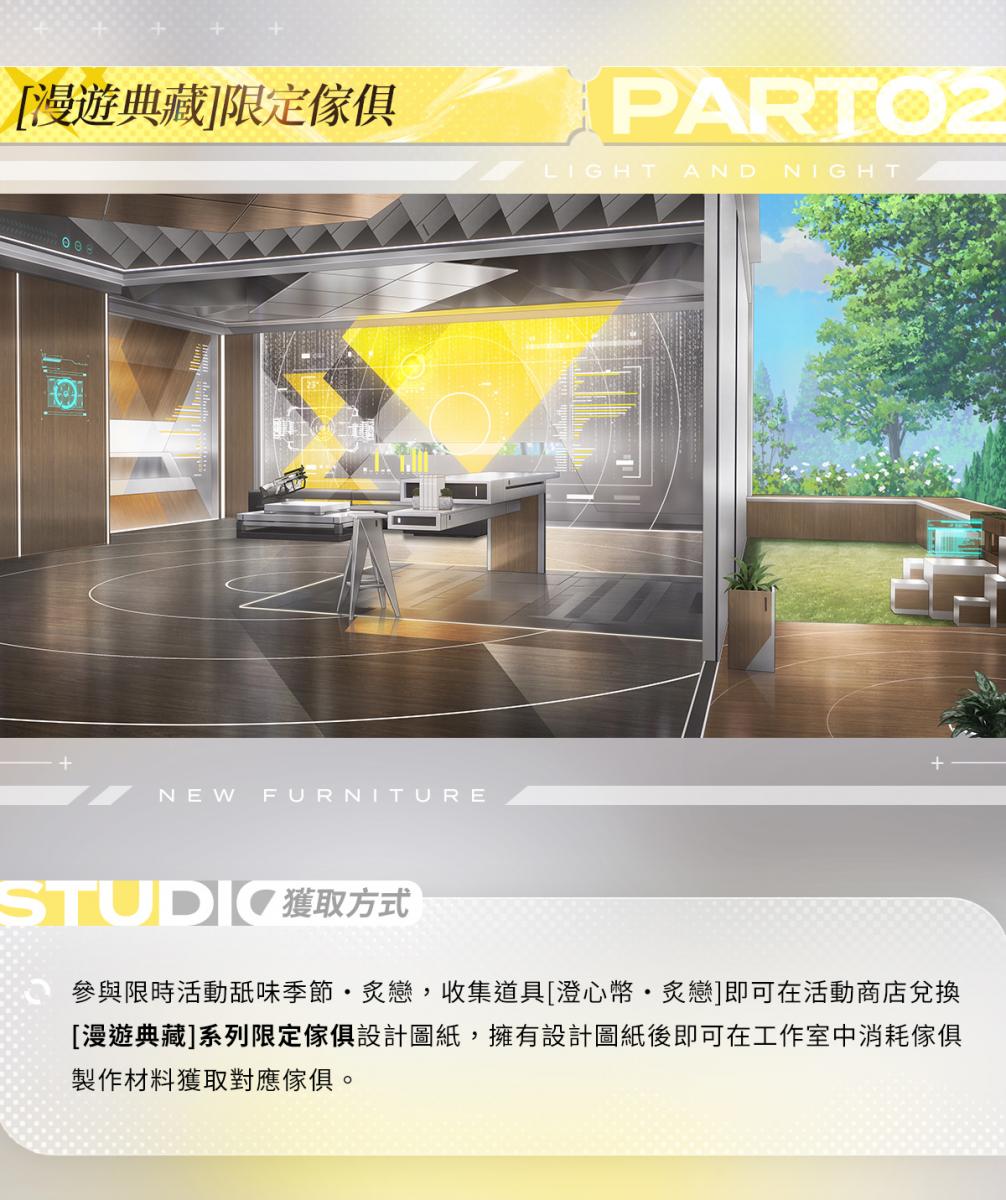 參與限時活動舐味季節・炙戀,收集道具[澄心幣・炙戀]即可在活動商店兌換漫遊典藏系列限定傢俱設計圖紙,擁有設計圖紙後即可在工作室中消耗傢俱製作材料獲取對應傢俱。